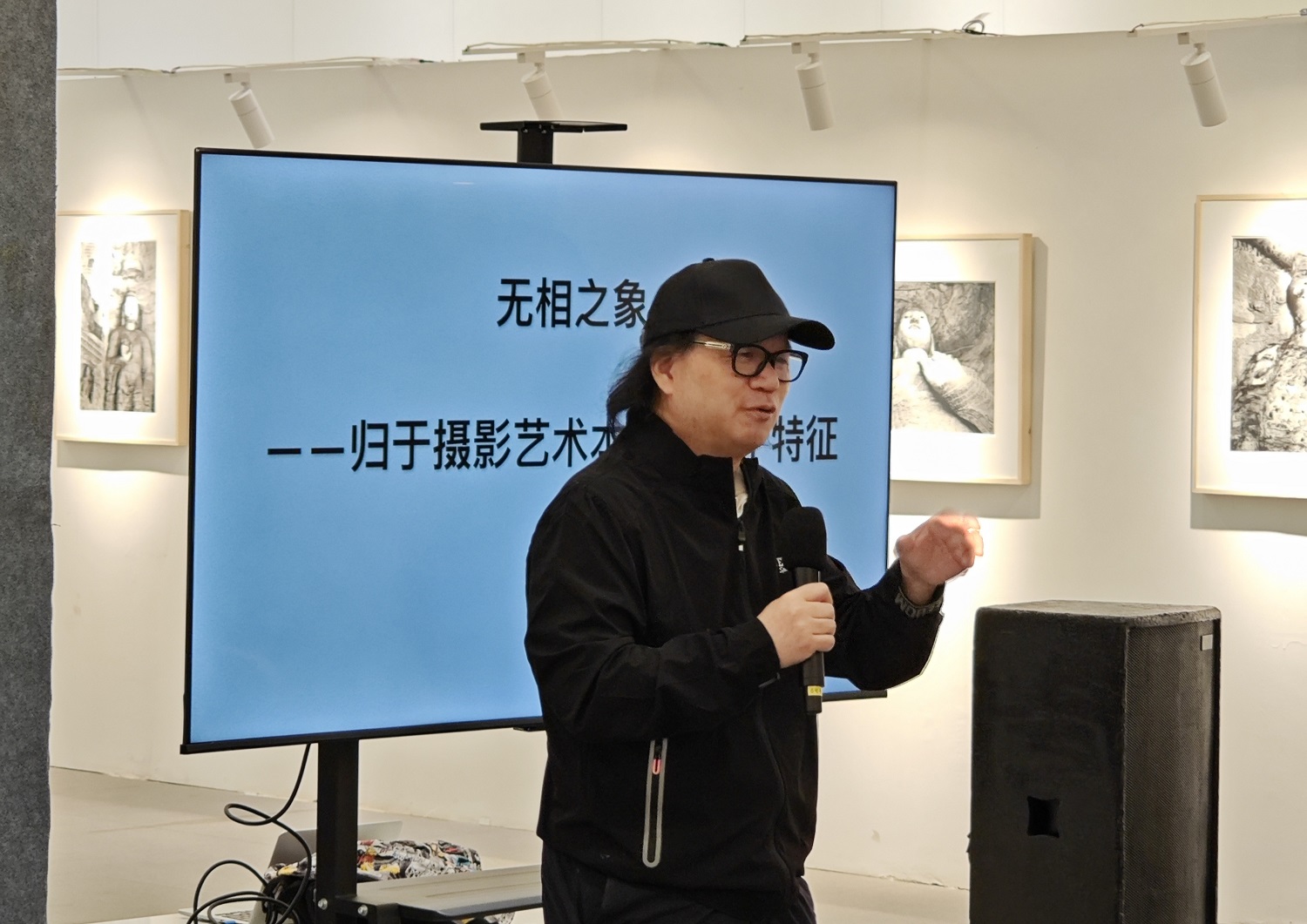 張玉明的講座《無相之象——歸于攝影藝術本身的五個特征》從被稱為美國當代攝影家薩考夫斯基提出的“它本身、框取、細節、時間、優勢點”5個攝影藝術共同特征入手,深入分析了攝影語言作為藝術與哲學的內在關聯。他認為,照片和照片上的事物之間的聯系是不確定的,因為它印證的是藝術家的內心。攝影家的信息純粹是視覺化的,“照片中表現的任何含義只能看不能說”;不相干的事物框取在一個畫面內也能產生新的象征,這就是其框取的作用和意義所在;由形狀、線條、明暗、質感、趣味中心組成的“細節”,是拍攝對象“固有”的,而不是像繪畫那樣是“給予”的;照片是對時間流的截取,也就是某個時間段的表達;其“優勢點”在于把俯視與仰視、長焦與廣角、隱藏在影子里,通過玻璃的反光,帶給我們不同凡響的攝影經驗。
