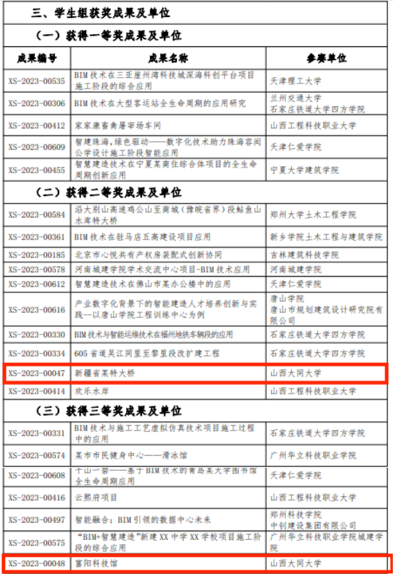 12月25日,第二屆住房和城鄉(xiāng)建設(shè)數(shù)字建造技能競賽“圖乘杯”BIM專項(xiàng)賽獲獎(jiǎng)成果揭曉(https://www.ccli.org.cn/szjzjnjs/bim-2023/index.html),建筑與測繪工程學(xué)院BIM協(xié)會(huì)兩支參賽隊(duì)伍分別獲大賽二等獎(jiǎng)和三等獎(jiǎng)。