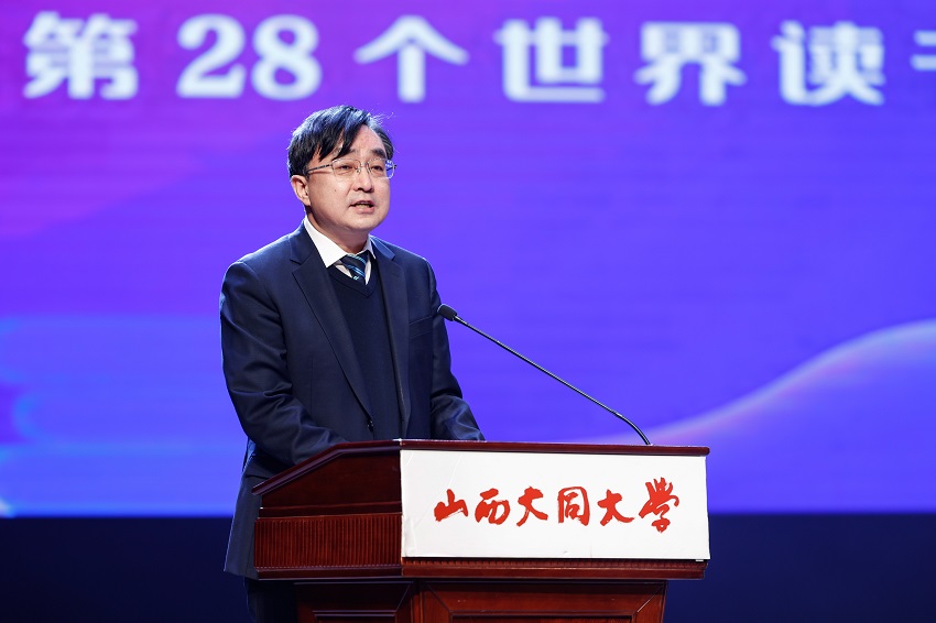 趙水民發(fā)表講話。他指出,讀書是中華民族的優(yōu)良傳統,是這個世界上門檻最低但最高貴的活動。習近平總書記在致首屆全民閱讀大會的賀信中強調,希望廣大黨員、干部帶頭讀書學習,修身養(yǎng)志,增長才干;希望孩子們養(yǎng)成閱讀習慣,快樂閱讀,健康成長;希望全社會都參與到閱讀中來,形成愛讀書、讀好書、善讀書的濃厚氛圍。我校從2020年開始,每年都堅持組織閱讀推廣、讀書交流、人文知識競賽等活動,數萬余師生參與其中,百余人次獲得省級以上獎項,學校連續(xù)多年受到華北地區(qū)、山西省圖書系統的表彰,馬克思主義學院、文學院、云岡學學院三個單位獲批山西省教科文衛(wèi)體職工書屋榮譽稱號,營造了濃厚校園文化氛圍,創(chuàng)建了良好文明育人環(huán)境。
