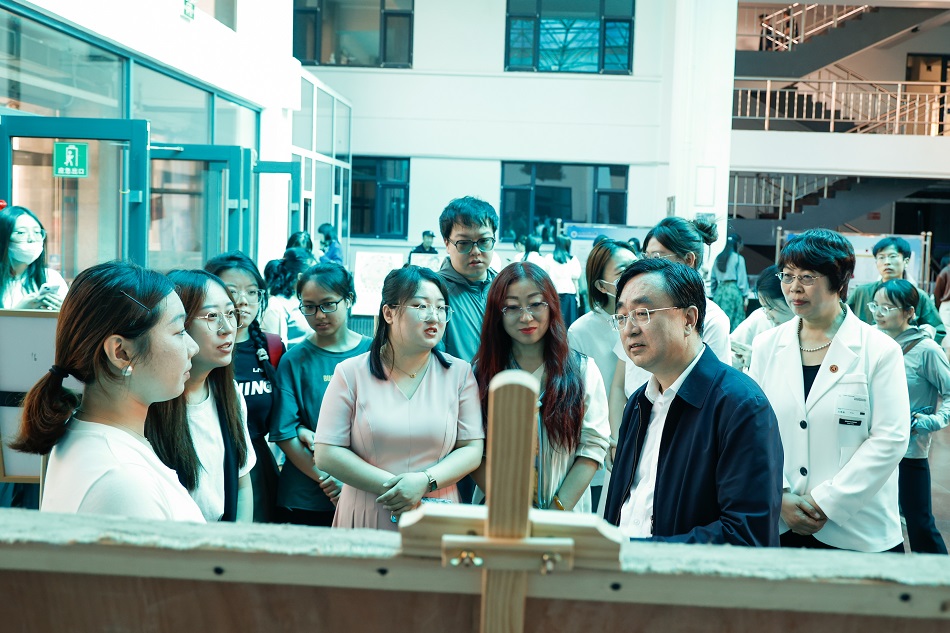 趙水民等與師生們認真觀摩了展出的作品,與云岡學(xué)學(xué)院班子成員及負責(zé)講解的師生們深入交流,共同探討同大云岡學(xué)建設(shè)之路。作為學(xué)校第十七屆校園文化藝術(shù)節(jié)、學(xué)院第三屆“云岡文化月”系列活動之一,該展共展出以山西寺觀壁畫為主題的20余幅壁畫臨摹作品、120件陶瓷修復(fù)器具,年代跨度從春秋戰(zhàn)國至明清。云岡學(xué)學(xué)院師生積極參與到講解中,通過專業(yè)視角和專業(yè)知識,向來賓們介紹壁畫藝術(shù)特色、陶瓷器的制作工藝及其修復(fù)技術(shù)。