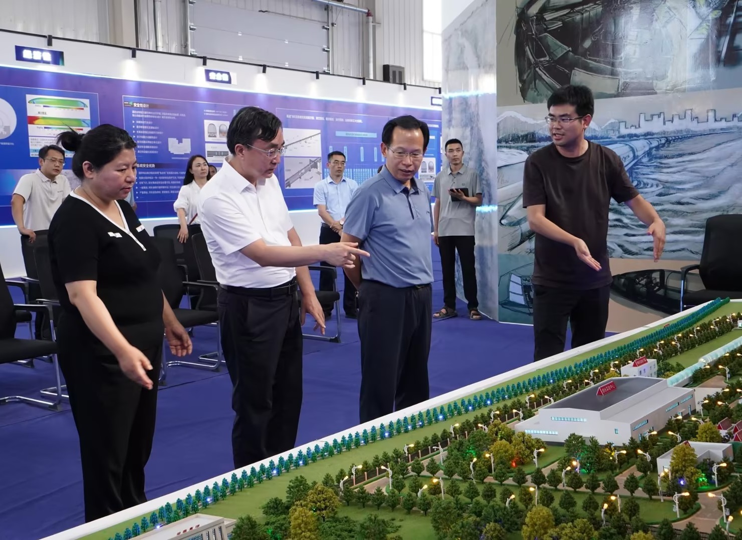 在高速飛車山西省實驗室執行主任毛凱的陪同下,趙水民一行先后參觀了高速飛車科技館、綜合試驗中心、指揮控制中心以及試驗現場。深入了解了高速飛車的歷史沿革、工作原理、發展前景等情況。通過觀看高速飛車宣傳片、體驗高速飛車沉浸式VR,直觀感受到了高速飛車的先進性、優越性和前沿性。