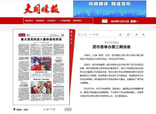 本報訊(記者 郝雨)近日,團市委在山西大同大學舉辦第三期促進大學生就業行動系列講座,400余名學子參加。