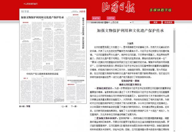 云岡石窟是我國三大石窟之一,是中國佛教藝術的巔峰之作,東西方文化融合的歷史豐碑,代表了公元五世紀世界雕刻藝術的最高水平。習近平總書記視察云岡石窟時強調,“云岡石窟是世界文化遺產,保護好云岡石窟,不僅具有中國意義,而且具有世界意義。歷史文化遺產是不可再生、不可替代的寶貴資源,要始終把保護放在第一位”“要深入挖掘云岡石窟蘊含的各民族交往交流交融的歷史內涵,增強中華民族共同體意識”。云岡研究院黨委深入貫徹落實習近平總書記在云岡石窟考察時的重要講話重要指示精神,積極踐行新時代文物工作方針,加強組織領導,周密安排部署,努力開拓創新,在云岡石窟文物保護利用和文化遺產保護傳承等方面不斷取得新成效,在打造云岡學研究高地和建設世界一流文化遺產地方面進行了積極探索和實踐。